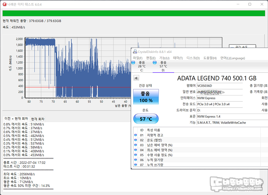 SSD의 공간을 연속 쓰기로 채워가며 전송속도를 측정하는 나래 온 더티 테스트에서는 캐시 영역이 끝나는 약 69% 구간을 내려가면서 속도 하락을 확인할 수 있으며 최대 속도 : 2056MiB/s, 최소 속도 : 10MiB/s, 평균 속도는 712 MiB/s, 평균 속도 50% 미만 구간은 14.3%, 테스트 시간은 31분 32초가 소요되었습니다.