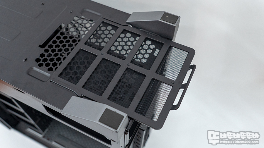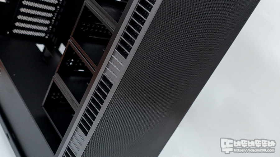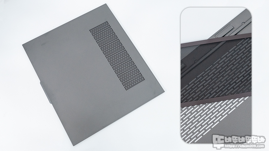 반대편 철재 사이드 패널의 경우도 공기 유입을 지원하는 타공홀과 고무자석을 이용한 먼지 필터 모습을 확인할 수 있습니다.