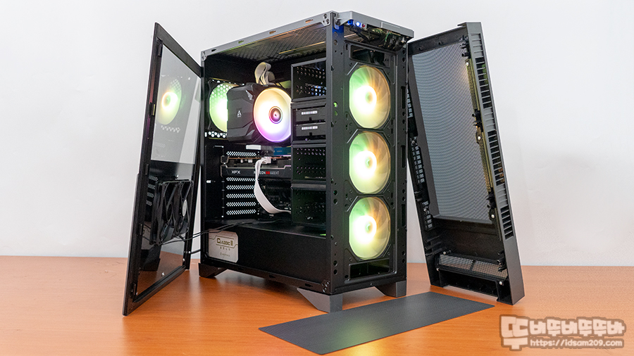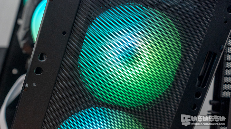 측면의 강화유리 패널은 하단부를 가리는 위치에 120mm 쿨링팬 2개가 장착되어 있는데 강화유리 패널을 절반만 사용한 게 아니라 쿨링팬이 장착되는 공간을 타공 처리하여 사용한 게 인상적이네요.