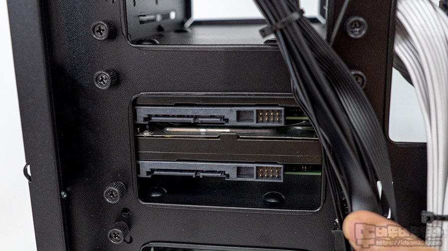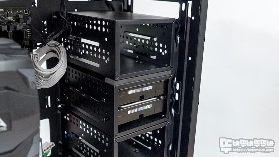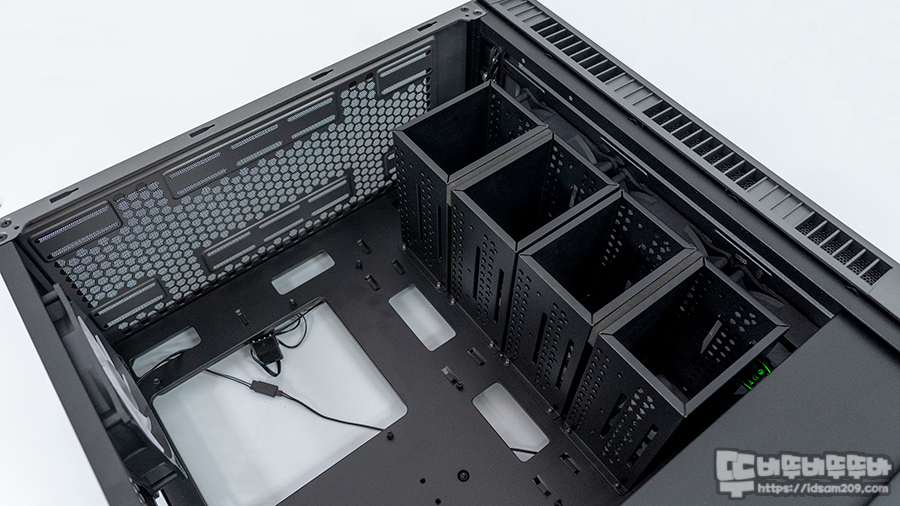 제가 받은 제품에는 하단부에 HDD 베이의 가이드가 누락이 되어 사진으로 노출되지 않지만, HDD 가이드는 SSD와 HDD를 겸용으로 사용할 수 있게 디자인되었으며 총 2개의 가이드로 구성되어 샤시 뒷면에 SSD 가이드와 하단의 HDD 베이를 SSD 최대 4개, HDD 조합 시 HDD 2개, SSD2개 또는 HDD 1개, SSD 3개로 구성할 수 있습니다.