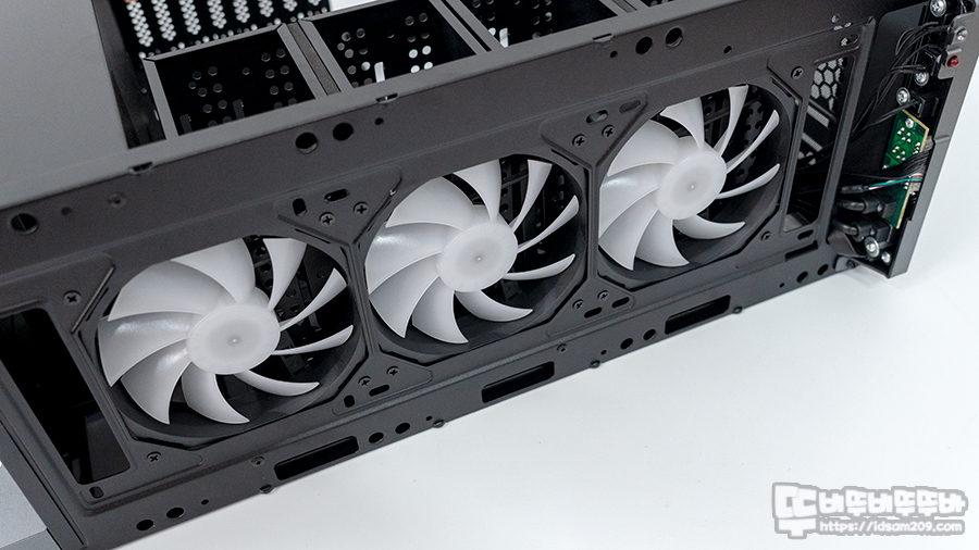 케이스 뒤쪽은 8개의 PCI 슬롯과 RGB 120mm 쿨링팬이 기본으로 제공되며 케이스 상단과 전면은 120mm/140mm 쿨러 3개 그리고 수랭쿨러 장착 시 전면의 경우 HDD 케이지를 제거하여 120/240/280/360mm 라디에이터 장착이 가능합니다.