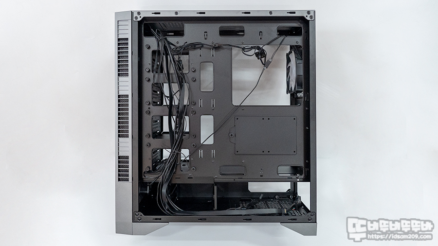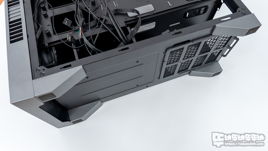 메인보드가 장착되는 샤시면은 M-ATX에서 ATX 규격에 최적화되어 있지만 E-ATX 장착 시 전면의 HDD 케이지 제거가 필요할 거 같네요.