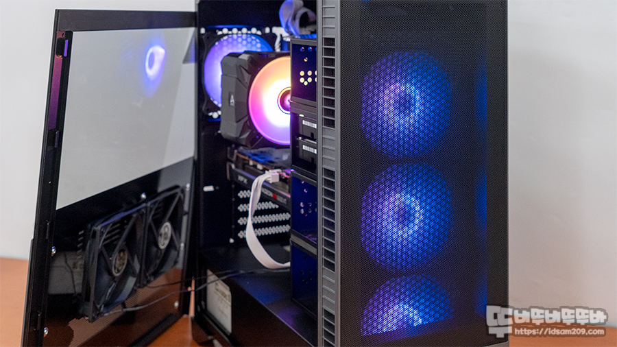 쿨링팬을 샤시 내부에서 처리할 수 없기에 케이블을 뒤쪽으로 넘겨 마무리를 하게 되는데 유지 보수를 위해서 강화유리 패널을 분리하더라도 쿨링팬을 연결한 케이블로 인하여 뒤쪽의 사이드 패널도 같이 분리해야 하는 번거로움이 생기네요.