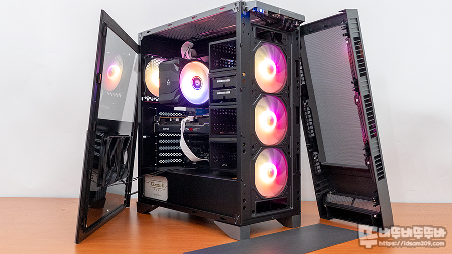 보통의 경우 강화유리 사이드 패널을 맨 마지막이 닫는 형태로 조립이 마무리되지만 마이크로닉스 GX2-뉴런 메쉬 미들타워 케이스의 경우는 강화유리 사이드 패널을 장착하고 뒷면에 사이드 패널을 맨 마지막에 닫는 형태의 조립이 되었습니다.