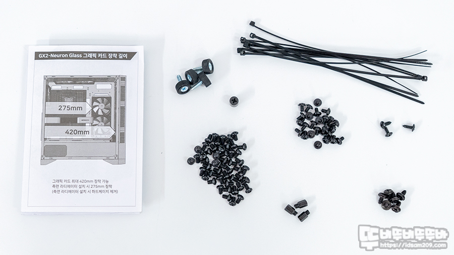 마이크로닉스 GX2-뉴런 메쉬 미들타워 케이스 구성품으로는 사용 설명서와 다양한 나사와 케이블 타이로 구성되어 있고요.