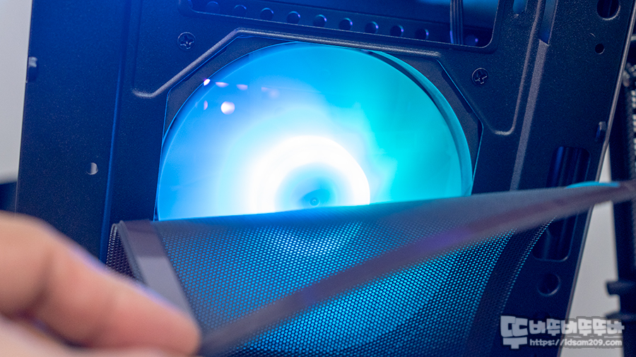 전면에 배젤을 제거하면 샤시에 부착된 먼지 필터와 120mm RGB LED 팬 모습을 확인할 수 있습니다.