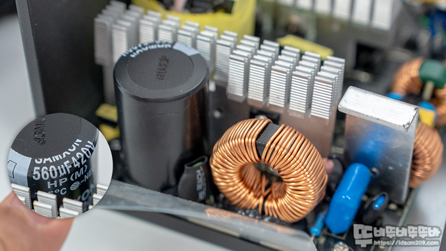 높은 내구성과 안정성을 담당하는 560㎌/420V 105℃ 콘덴서와 Active PFC 구성 모습.