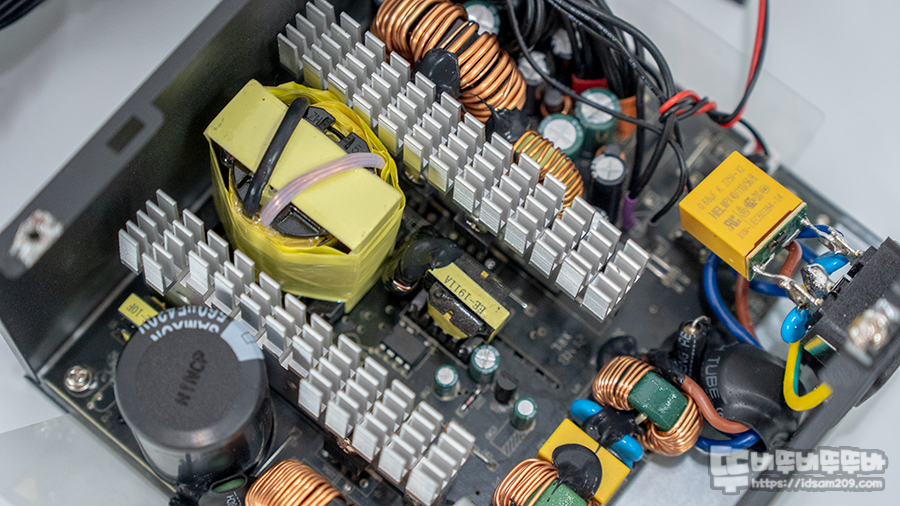 파워 서플라이 중앙에는 정전압 IC의 열기를 해소하는 알루미늄 히트싱크와 DC 전류를 세분화는 스위칭 트랜스 모습.