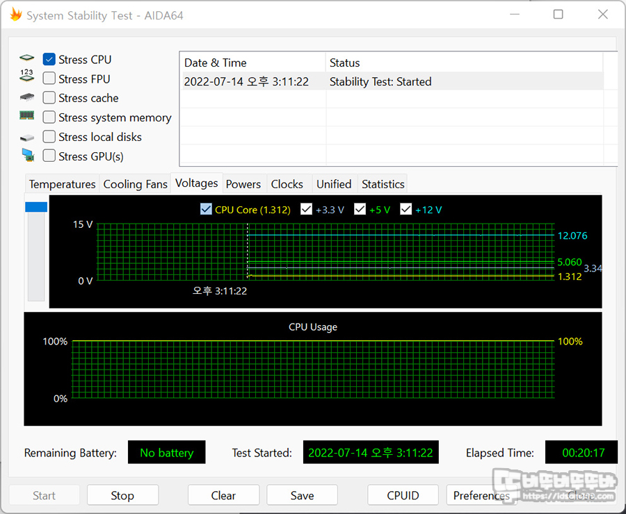 조립 이후 AIDA64의 시스템 안정화 테스트를 약 20분간 진행해 보고, OCCT를 7분간 진행해 보았습니다.