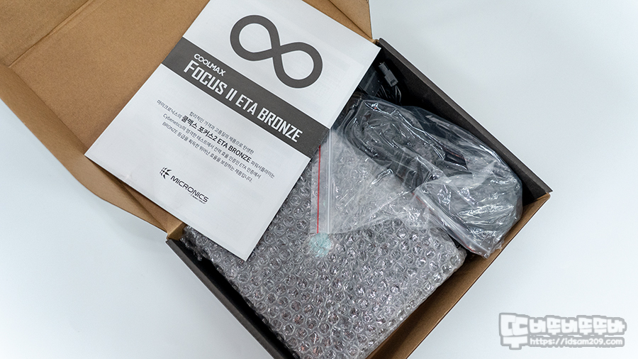 제품은 마이크로닉스 COOLMAX FOCUS II 800W ETA BRONZE 파워서플라이 본체, 케이블 타이, 케이스 샤시 고정 나사, AC 코드, 간단 사용 설명서로 구성되어 있습니다.