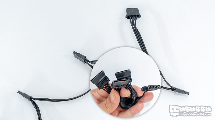 SATA 커넥트 2개, IDE 커넥트 2개로 구성된 케이블은 400+150+150+150±20mm 길이로 구성되어 기본적인 파워 서플라이 케이블 모습을 보여주고 있습니다.