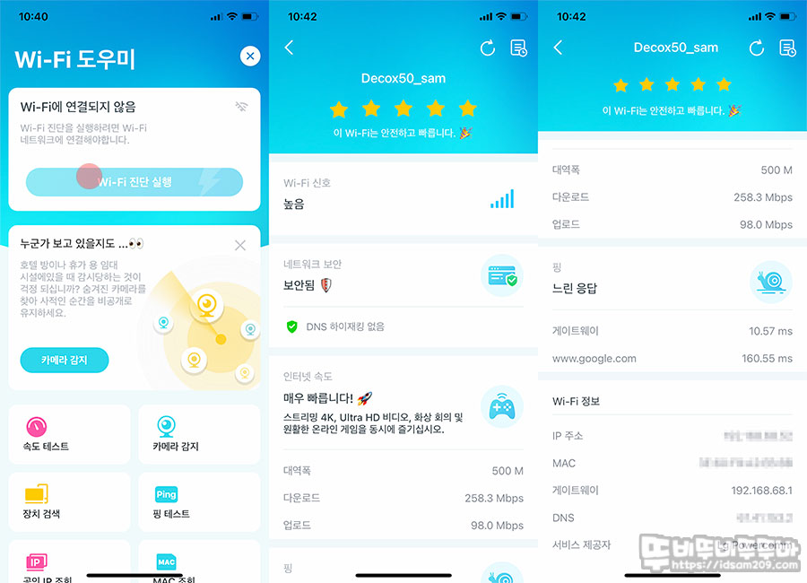 최초 설정 후 Wi-Fi 진단을 하면 Wi-Fi 신호, 보안상태, 속도, IP 정보 등을 보여줍니다.