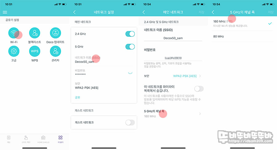 우리가 보통 유무선 공유기를 사용하다 보면 2.4GHz / 5GHz 주파수의 채널을 변경해야 하는 상황이 발생하기도 하는데 Deco X50의 경우 주파수별 채널 변경을 지원하지 않습니다.