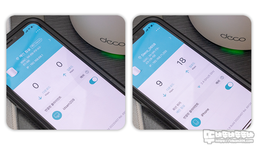 위의 설치도에서 A 위치에 메인 Deco에 근접했을 때 iPhone 연결과 B 위치의 세컨드 Deco에 근접했을 때 iPhone 연결 모습.