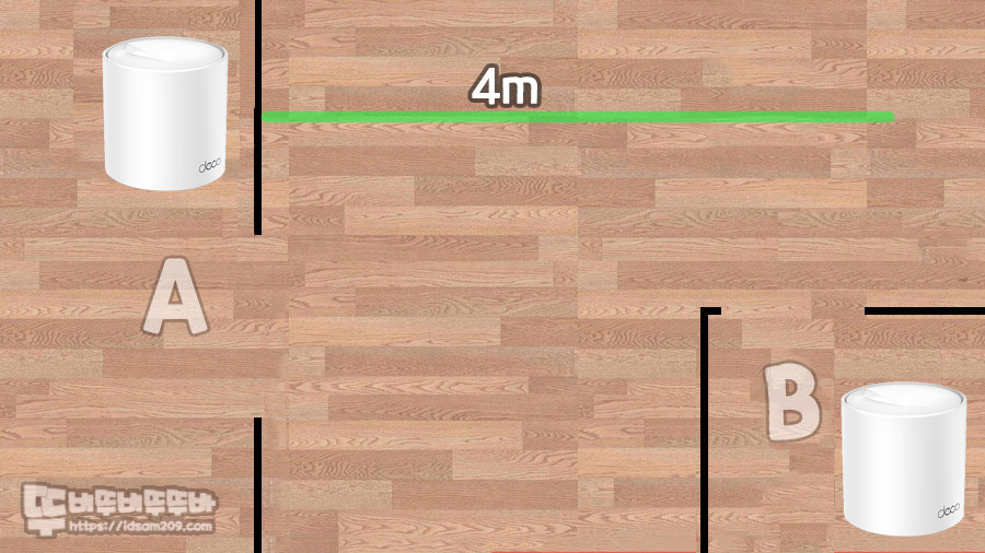 티피링크 Deco X50 메인을 A 위치 설치하여 인터넷 라인과 PC 연결, 나머지를 B 위치에 전원 아답터만 연결하여 DECO APP으로 세팅할 예정이며 X50 끼리는 무선 백홀로 구성되었습니다.