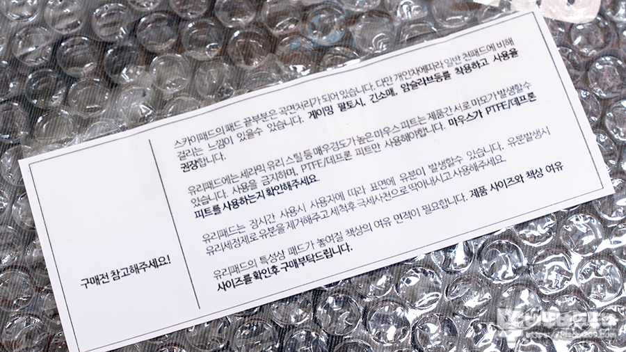 3. 마우스 피트 사용 주의 - 유리 패드는 마우스 피트의 마모가 발생할 수 있는데 강대강의 소재가 사용되면 스크래치가 발생할 수 있으니 PTFE/테플론 소재의 피트를 사용하시기 바랍니다.