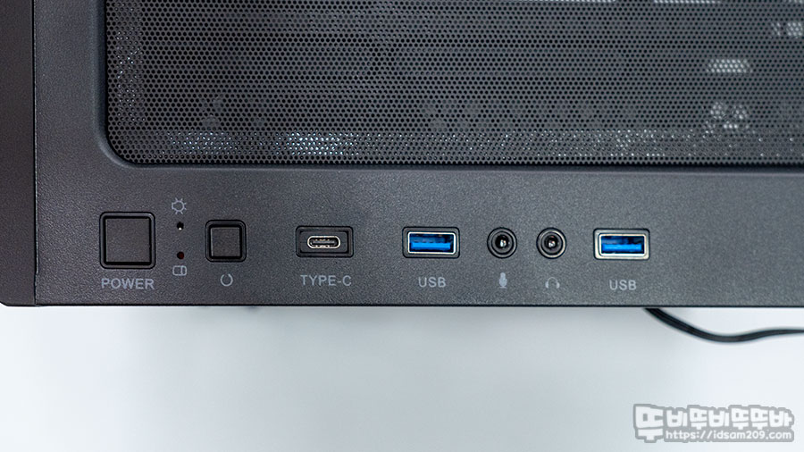 샤시 측면에 위치한 I/O 포트는 전원 버튼 / 전원&HDD LED 인디케이터 / 리셋 버튼 / USB-C / USB 3.0 2개 / HD AUDIO로 구성되어 있으며 아쉽게도 USB 2.0 포트는 지원되지 않습니다.