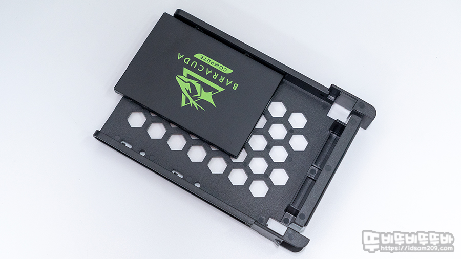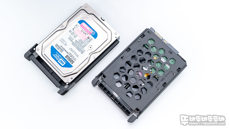 전면으로 탈거하는 HDD/SSD 가이드는 가이드 측면에 고정 핀 부분을 살짝 당겨 HDD를 장착하게 되며 SSD는 바닥면에 SSD 홀에 고정나사를 이용하여 고정하게 됩니다.