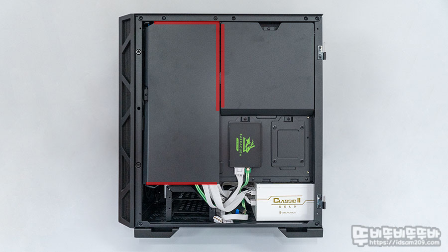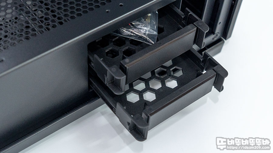 샤시 뒷면에는 SSD 장착을 위한 가이드 그리고 하단부에는 파워서플라이 장착 공간과 전면에서 장착이 가능한 HDD/SSD 가이드 모습을 확인할 수 있습니다.