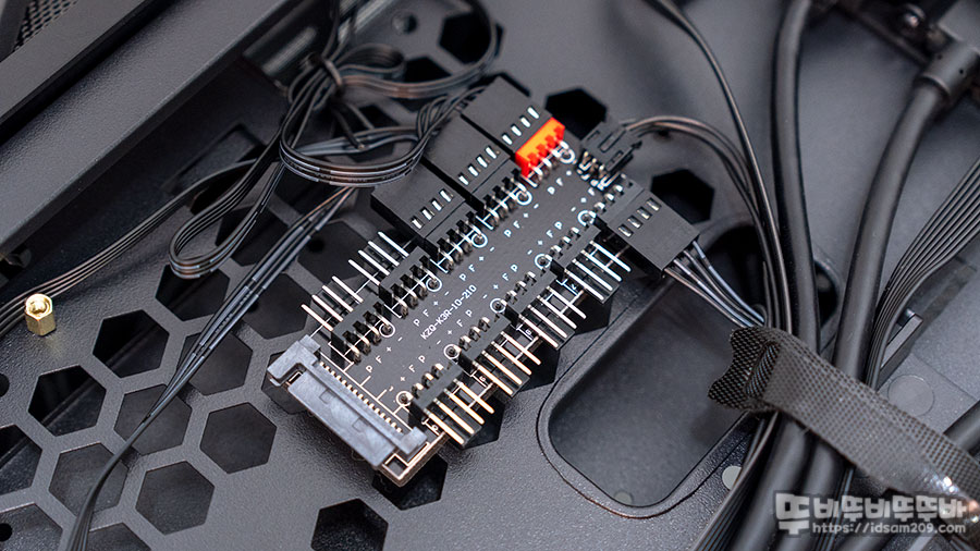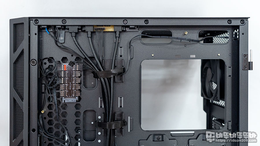 메인보드를 장착하고 상단에 보조 전원 케이블을 넘겨 조립이 가능한 여유 있는 상단의 모습, 전면과 후면의 PWM 4핀으로 구성된 쿨링팬을 연결하여 통합으로 제어할 수 있는 팬 허브, 중앙 부분에 케이블 정리를 위한 가이드와 벨크로 타이 등이 눈에 띄고요.