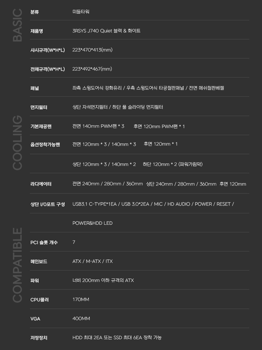 #3RSYS #J740 #Quiet #미들타워 #케이스 #펜허브제공 #저소음쿨링 #스윙도어 #뚜비뚜비뚜뚜바 #idsam209
