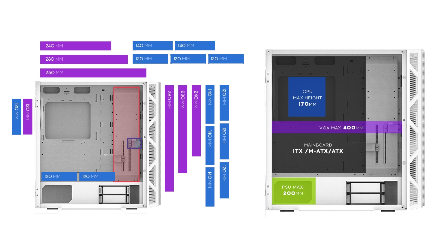 제품의 상세 내역의 쿨링 팬 구성 및 내부 부품 지원 그리고 HDD/SSD 장착에 대한 부분을 살펴보았을 때 그래픽 카드 400mm 길이는 전면 샤시에 수랭 쿨러 장착 여부에 따라 공간이 줄어들 수 있으니 참고하시기 바랍니다.