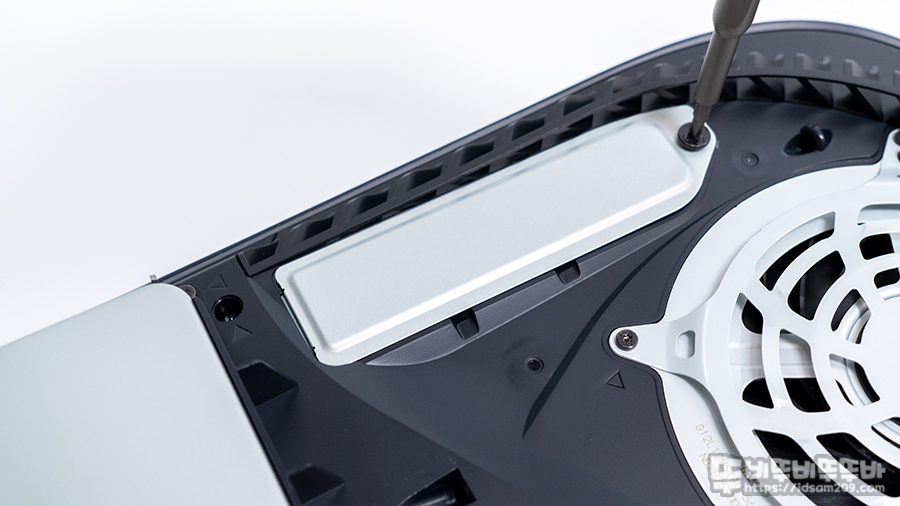 필자가 보유 중인 PS5는 디스크 버전으로 디스크 드라이브가 있는 면을 오픈하면 위와 같이 철재로 된 커버를 보게 됩니다.