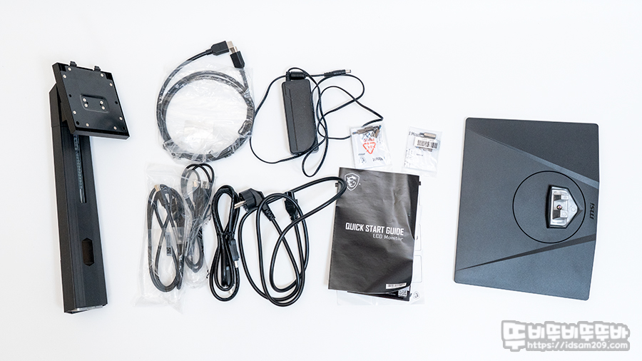 제품은 모니터 이외 모니터 스탠드, 받침대, 설명서, 전원 케이블 및 전원 아답터, HDMI, DP 케이블, 업스트림 USB Type B to A 케이블 2.0/3.0 각각 1개, VESA 마운트 연결용 스탠드오프와 스탠드 고정용 나사로 구성되어 있고요.