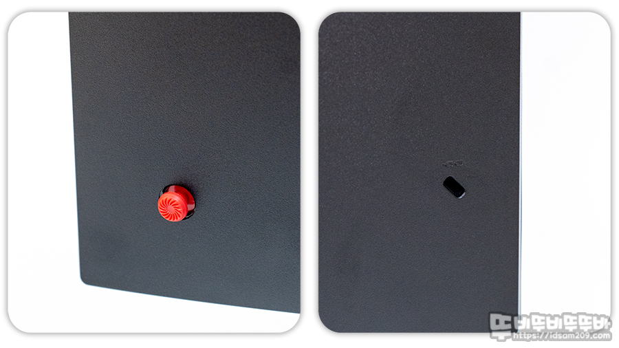 모니터 뒤쪽에는 빨간색 5축 OSD 조그 버튼, 켄싱턴 락 홀이 눈에 띕니다.