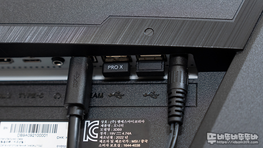 입력 포트를 확인해 보면 DP포트, HDMI1, HDMI2, Type-C, 오디오 출력 단자, UP STREAM USB-B 단자, USB-A 2.0 포트 그리고 전원 소켓으로 구성되어 있으며 4개의 입력 소스를 활용할 수 있는 부분은 MSI 옵틱스 MAG321QR 게이밍 모니터만의 장점인 거 같습니다.