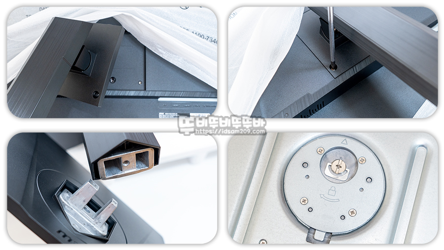 모니터 스탠드 연결 시 가급적 포장을 완전히 오픈하지 마시고 스티로폼에 모니터가 안착된 상태에서 포장 비닐을 살짝 올려 스탠드와 받침대를 결합하신 후 모니터 포장을 분리하시기 바랍니다.