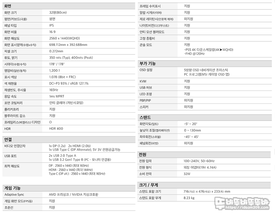 IPS 패널에 32인치 화면, 16:9 비율의 2560X1440(WQHD) 해상도, 픽셀 크기 0.272mm, 밝기 350니트(최대 400니트), 명암비 1200:1, 색 재현율 DCI-P3 93%/sRGB 127.1%, 주사율 최대 165Hz, 응답속도 1ms MPRT