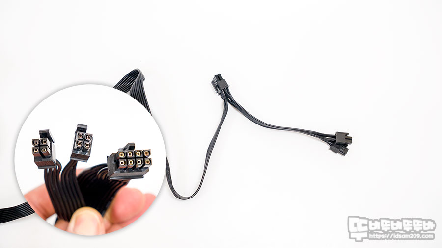 2개의 케이블로 구성된 450+150mm 길이의 PCIe 8핀(6+2) 그래픽카드 보조전원 커넥터 모습.