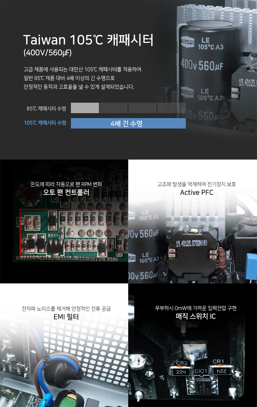 TEAPO사의 105℃ 온도를 견디는 400V 560㎌ 콘덴서와 고급스러운 디자인의 코일이 사용된 역률 99% 효율 담당하는 액티브 PFC 회로, 온도에 따라 팬 RPM 변화를 주는 오토 팬 컨트롤러 그리고 AC 소켓 부분에 부착된 무부하 시 0mW에 가까운 입력 전압을 구현하는 매직 스위치 회로와 소켓 부분과 기판 부분에 2중으로 설계된 전자파 노이즈를 제거하는 EMI 필터 구현과 DC to DC 회로 적용으로 안정적인 +3.3V, +5V, +12V 전압 출력을 지원하고 있습니다.