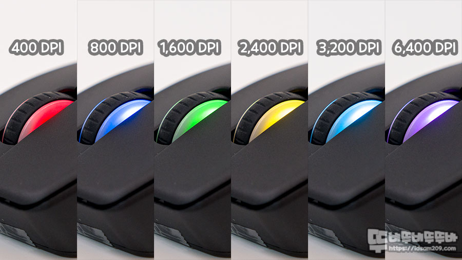 DPI 컬러는 DPI 라인 앞쪽의 컬러 박스를 선택하여 변경이 가능하며 기본값을 살펴보면 레드 (400) - 블루 (800) - 그린 (1600) - 옐로우 (2400) - 스카이 블루 (3200) - 퍼플 (6400)으로 표현됩니다.