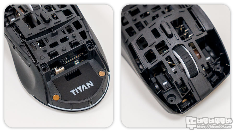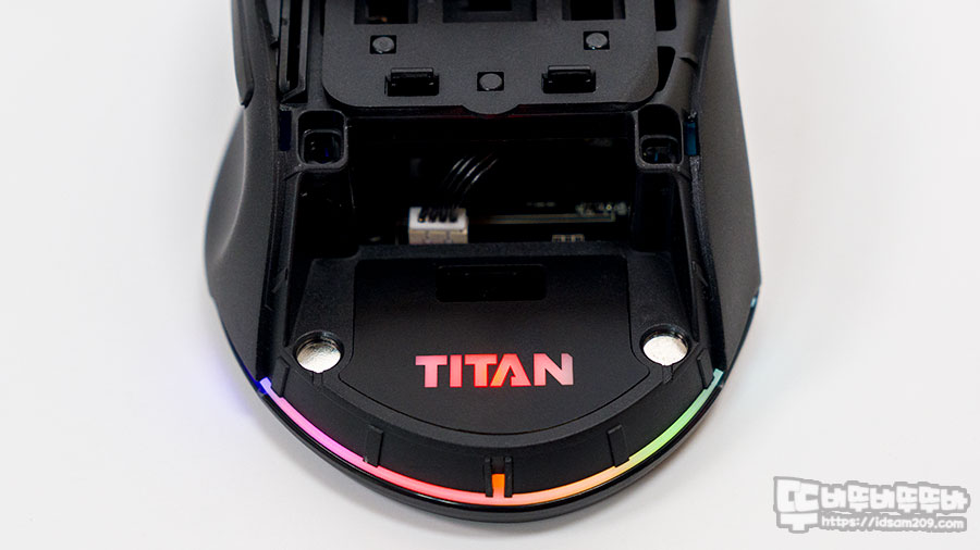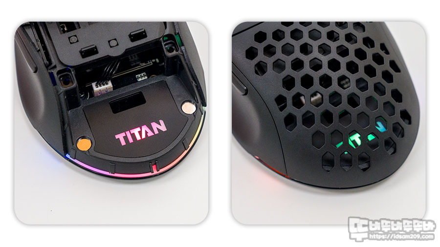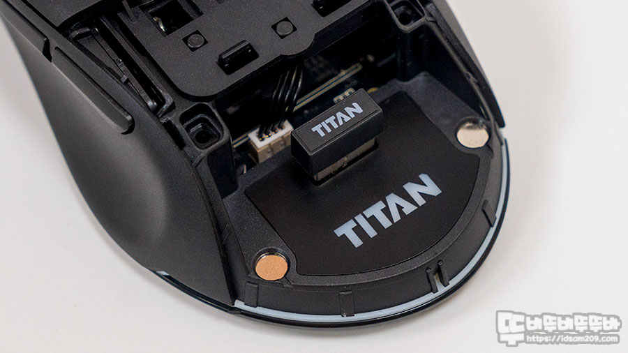 마우스 뒷부분 하단에는 RGB LED 라이팅을 표현하는 디퓨저 부분은 전작과 동일하게 커버를 오픈했을 때 TITAN 로고 부분도 동시에 LED 라이팅이 표현됩니다.