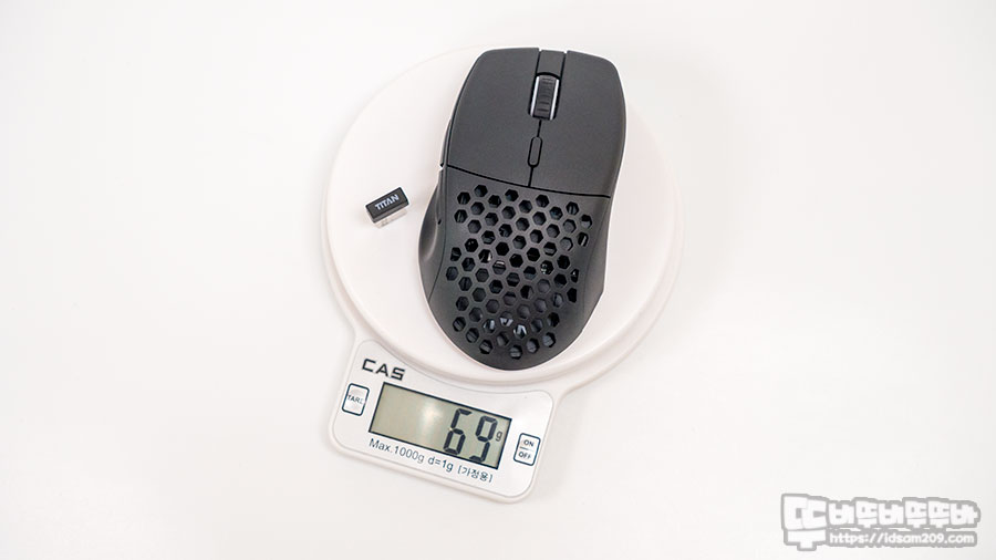TITAN GT AIR 무게는 타공 커버 사용 시 약 68g, 솔리드 커버 사용 시 약 69g, 무선 리시버 추가 시 약 1g 무게가 추가되며 전체적으로 60g대의 경량형 무게감으로 사용 및 휴대 시 무게에 대한 부담감이 없는 편입니다.