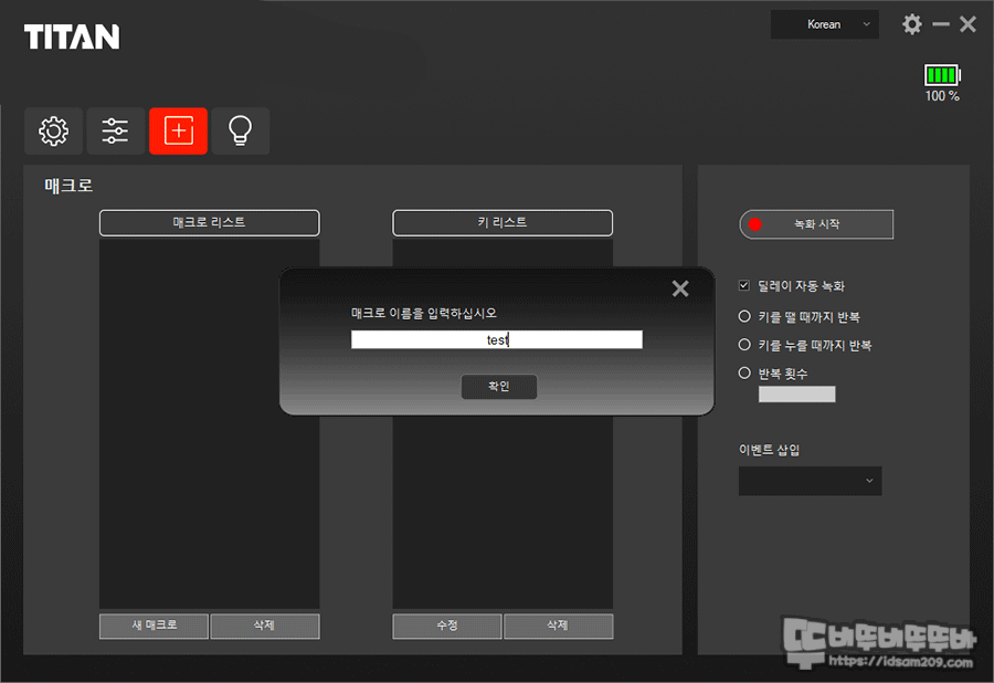 매크로 메뉴에서는 새 매크로 - 매크로 키 이름 입력 - 녹화 시작 버튼 - 매크로 키 입력 - 녹화 종료 - 저장 순으로 진행하게 되는데요.