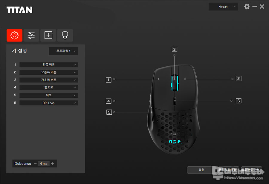마우스 버튼 사용 시 클릭 후 다음 클릭 시 반응을 조절할 수 있는 디바운스 기본값 4ms으로 설정되어 있지만 0~30ms까지 선택이 가능한데 가급적 기본값 앞뒤에 근접한 수치로 적당하게 선택하시는 걸 추천드리는데요.