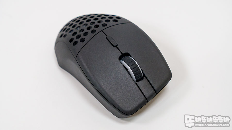 타이탄 GT AIR 무선 마우스는 정면뿐만 아니라 버튼 형태도 비대칭으로 디자인되어 검지 및 중지 손가락을 편안하게 마우스 버튼에 사용할 수 있었습니다.