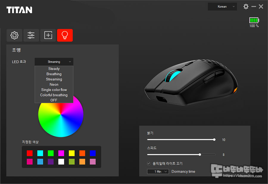 LED 효과 메뉴는 6가지의 효과 및 컬러 선택 그리고 밝기와 속도 조절 선택이 가능하며 마우스가 움직일 때 LED를 끄는 옵션을 지원하여 배터리 절약을 위해서 가급적 마우스가 움직일 때는 LED를 빠르게 꺼지는 설정을 해주시는 게 좋습니다.