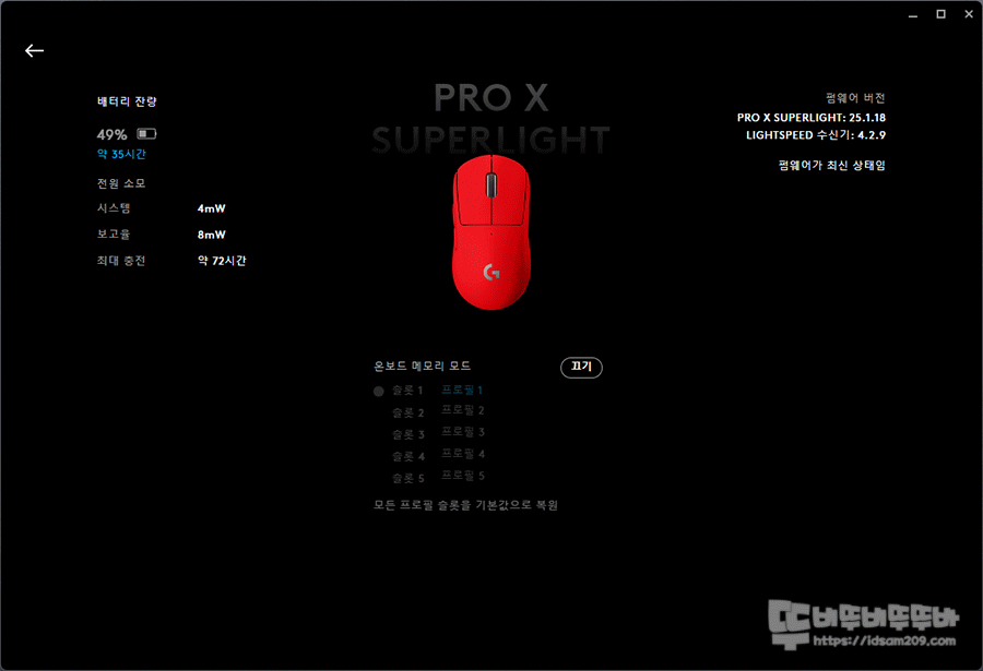 그리고 G-HUB의 필수 기능이라 할 수 있는 온보드 메모리 모드는 컴퓨터 부팅 시 DPI 설정이 변경되는 경우 소프트웨어로 해결할 수 없기에 대부분의 유저들이 활용하는 부분이 온보드 메모리 모드로 내가 지정한 최애 DPI 값으로 컴퓨터 부팅에서 종료까지 사용이 가능하니 온보드 메모리 모드 활용을 잘 활용하시기 바랍니다.