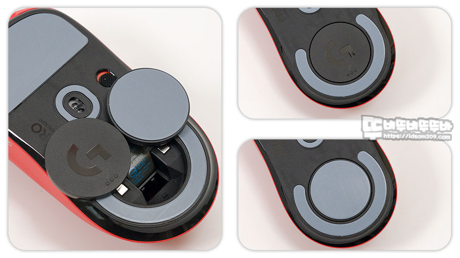 후면의 G 로고가 각인된 원형 커버는 PTFE 피트가 적용된 커버로 변경하여 사용 시 패드와의 마찰력을 증가시켜 경량형 마우스인 로지텍 G Pro X SUPERLIGHT의 브레이킹에 도움을 주니 참고하시기 바랍니다.