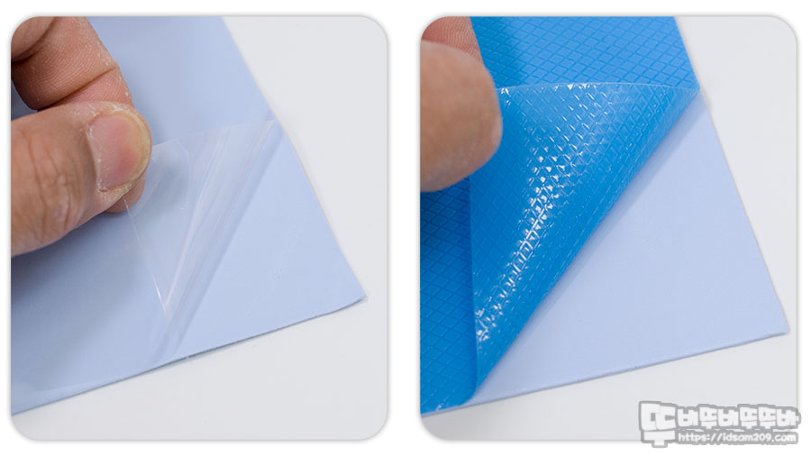 TP-3 써멀패드의 경우 앞에는 얇은 비닐, 두꺼운 비닐로 써멀 패드를 보호하고 있어 비닐을 모두 제거 시 제단하기 어려움이 있으니 비닐이 덮여있는 상태에서 필요한 사이즈만큼 제단 후 비닐을 제거하고 사용하시는 게 좋을 거 같습니다.