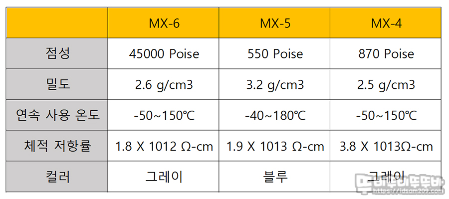 공식 홈페이지에서는 MX-5 정보가 없어져 아틱 사이트와 판매처의 상세 설명을 참고로 도표를 만들어 보았습니다.