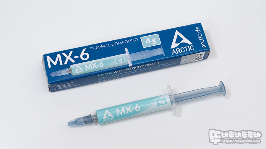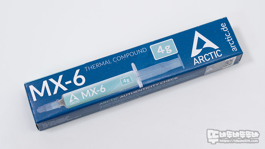 먼저 ARCTIC MX-6 써멀 구리스 패키지에는 주사기 타입의 제품 이미지와 모델명 MX-6 그리고 용량 4g 표기를 확인할 수 있고요.