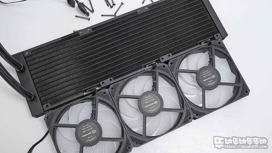 예전에 수랭쿨러 리뷰를 하면서 라디에이터에 팬 허브가 있는 제품을 사용하면서 쿨링팬 커넥터를 깔끔하게 정리할 수 있어서 좋다는 생각을 했었는데 데이지 체인 방식으로 라디에이터에 쿨링팬을 직접 부착하는 방식은 가히 센세이션 한 충격을 주었습니다.