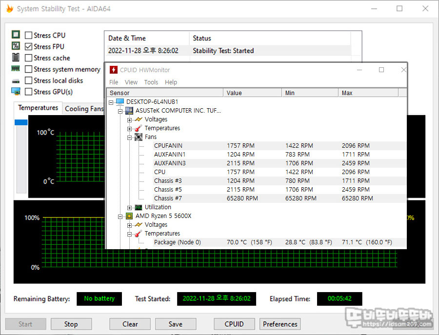 Stress CPU 테스트에서는 5분 38초 타이밍 시 약 60.8도 온도를 보여주며 Stress FPU 테스트에서는 5분 42초가 되는 시점의 온도는 70도를 보여줍니다.