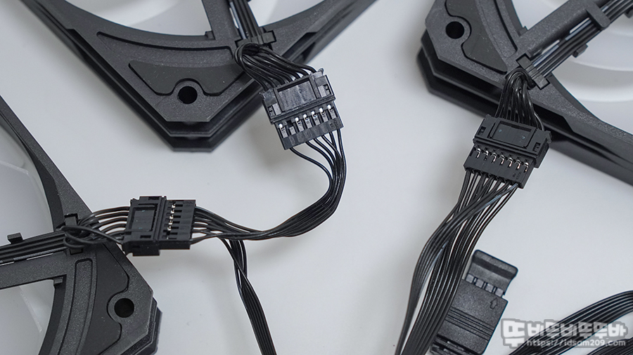 쿨링팬을 연결하는 케이블은 라이데이터 연결하는 커넥터와 PWM 4핀 커넥터 그리고 +5V ARGB 3핀 커넥터로 구성되어 있어 있습니다.
