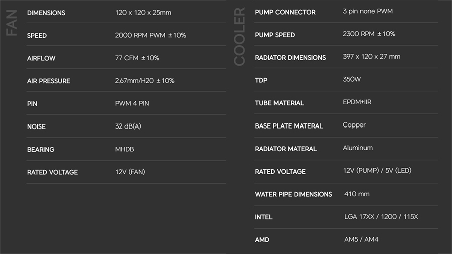 구리 베이스의 워터펌프는 2300 rpm 속도로 순환을 하며 알루미늄 베이스의 라디에이터를 통해 빠른 냉각을 지원하는데 이번 제품은 라디에이터에 쿨링팬을 직접 연결하는 커넥터가 앞뒤로 내장되어 데이지 체인 방식으로 조립하는 방식을 제공합니다.